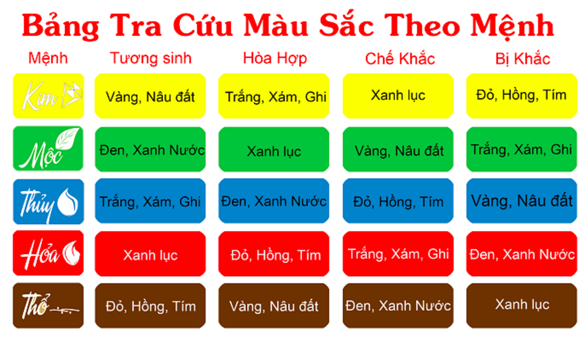 Theo phong thủy, ngũ hành ứng với màu sắc thì mỗi mệnh sẽ có bảng màu tương sinh và tương khắc khác nhau. Lời khuyên là bạn nên chọn màu sắc gạch tương sinh với bản mệnh của chính mình và ngược lại nên hạn chế dùng màu tương khắc với bản mệnh để tránh những vận xui xẻo.